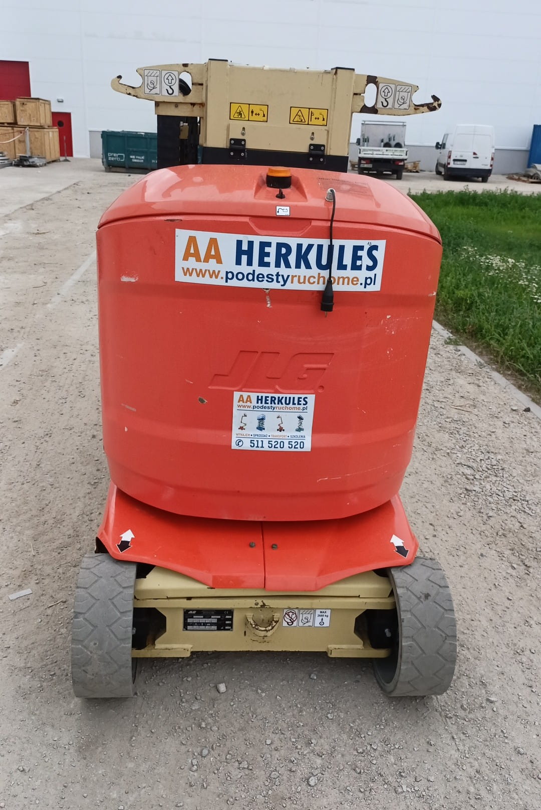 Podnośnik może podnosić 2 osoby, a sama waga maszyny to około 4900 kg. Model posiada elektryczne zasilanie z akumulatorów.