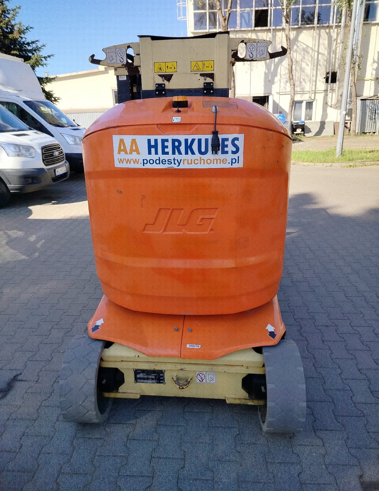 Podnośnik może podnosić 2 osoby, a sama waga maszyny to około 4900 kg. Model posiada elektryczne zasilanie z akumulatorów.