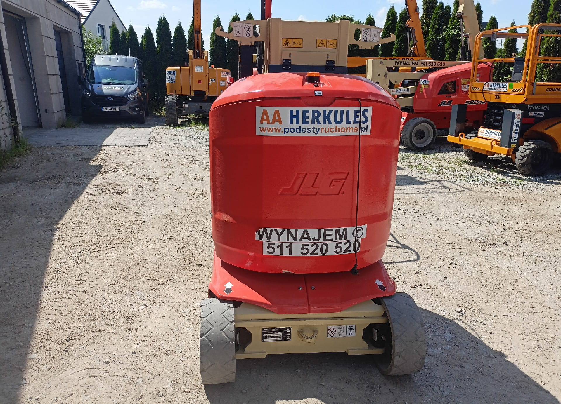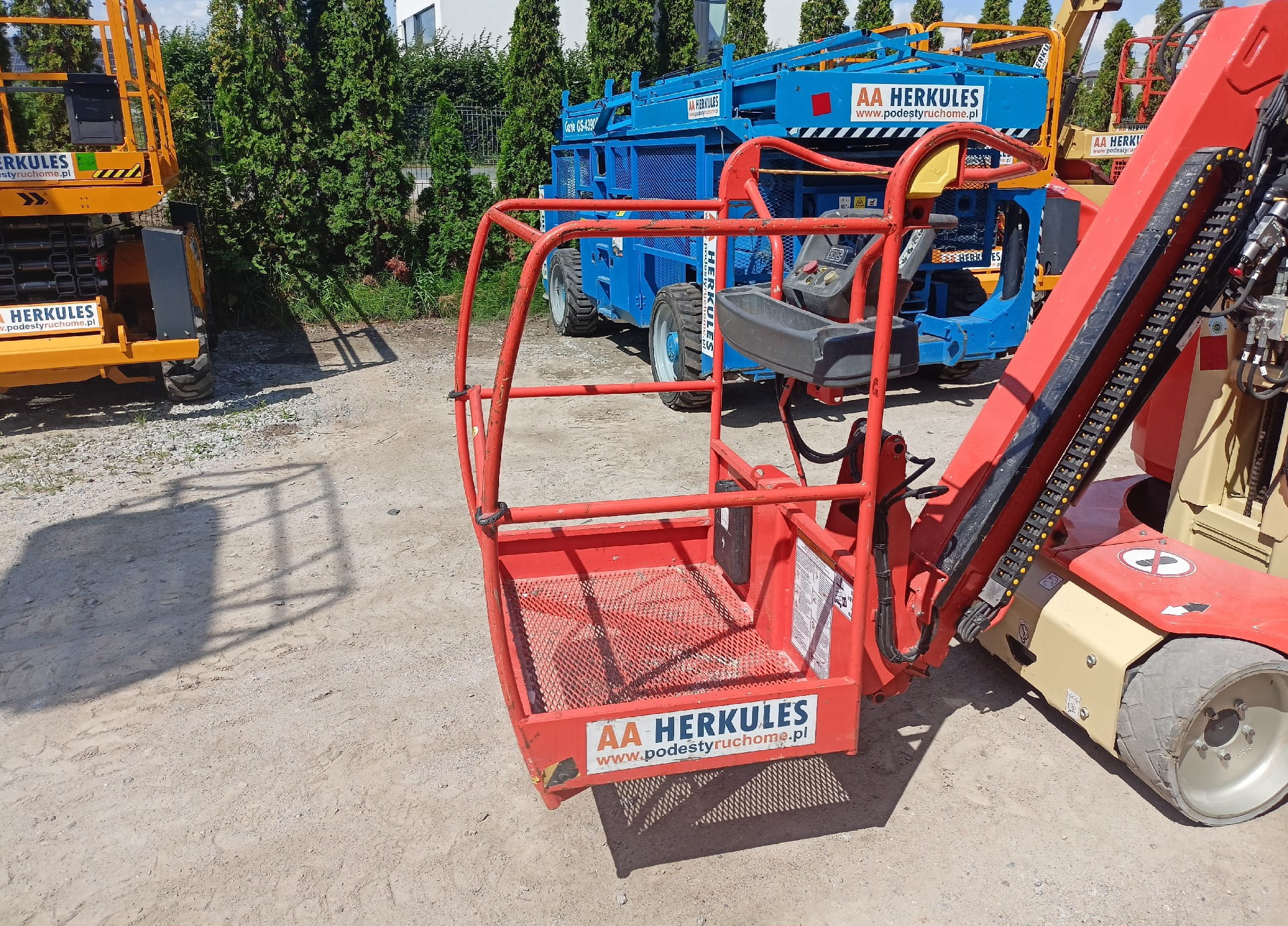 Podnośnik może podnosić 2 osoby, a sama waga maszyny to około 4900 kg. Model posiada elektryczne zasilanie z akumulatorów.