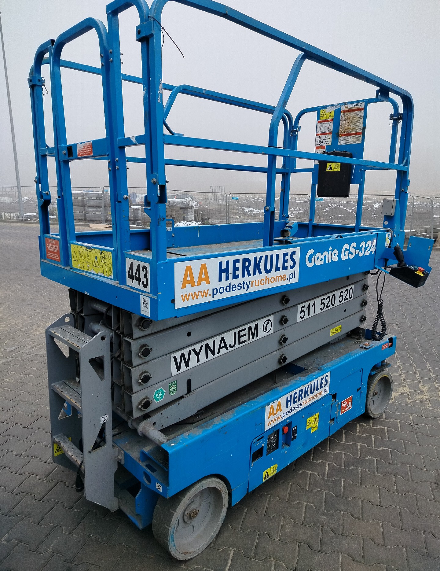 Na platformie może pracować do 2 osób, a sama waga maszyny to około 2367 kg. Model z elektrycznym zasilaniem z akumulatorów.